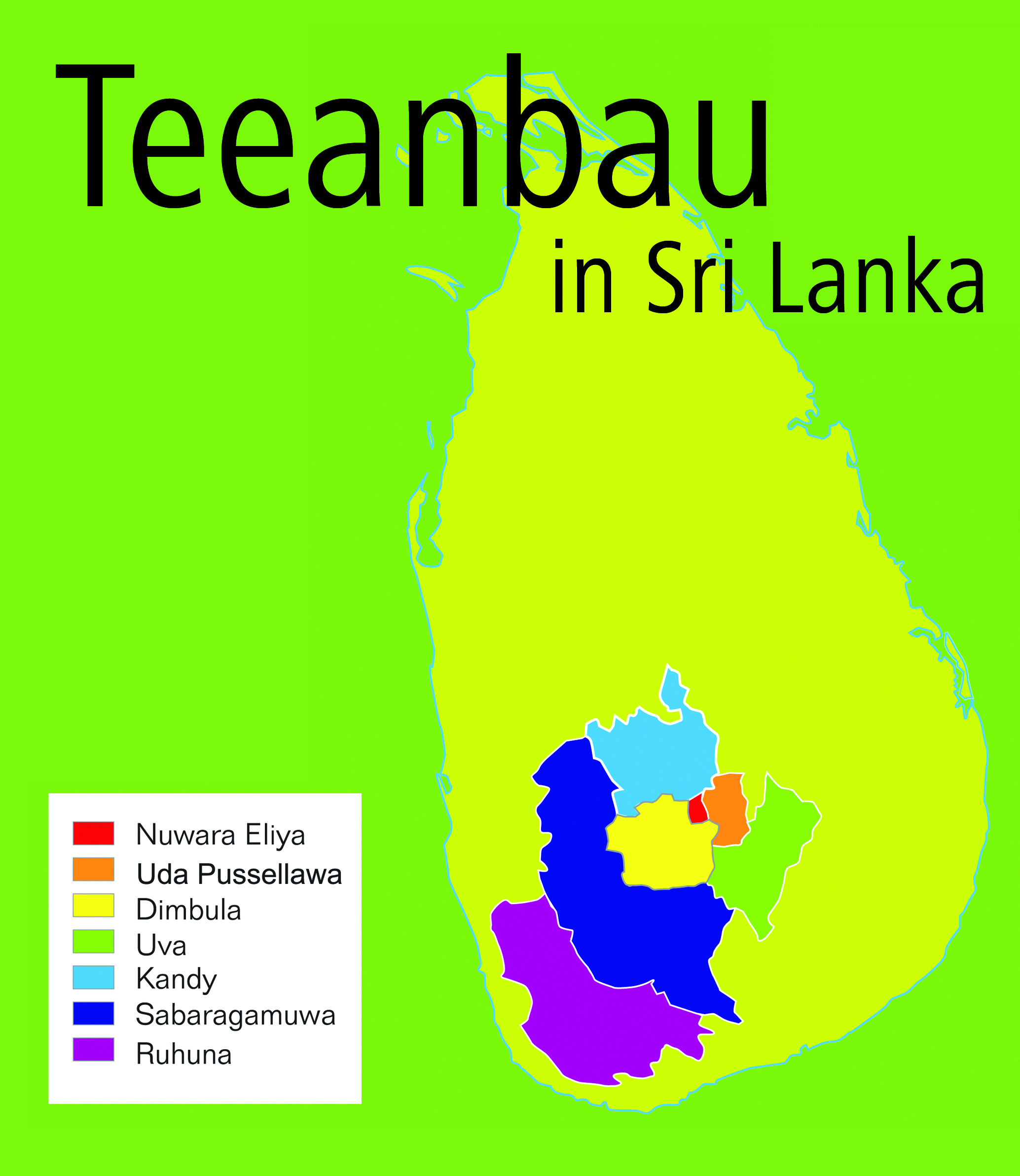 Die Teeanbaugebiete der tropisch-warmen Insel im Indischen Ozean erstrecken sich um den 2.243 Meter hohen Berg Sri Pada (früher Adam“s Peak). Hier im südwestlichen Gebirgsmassiv sind die Teepflanzen starken jahreszeitlichen Wetterschwankungen ausgesetzt, so dass in den Regionen zeitlich unterschiedlich geerntet wird. Im Hochland über 1.200 Metern wachsen in den Gebieten Dimbula, Uva, Uda Pussellawa und Nuwara-Eliya Spitzentees. Die Höhe lässt die Blättchen vergleichsweise langsam wachsen, so dass sie einen außerordentlich weichen, aromenreichen Geschmack entwickeln. Ihr kupferroter bis goldroter Aufguss ist bei Teekennern heiß begehrt. Tiefer gelegen sind die Tee-Anbaugebiete Kandy (600 bis 1200 Meter) sowie Sabaragamuwa und Ruhuna (0 bis 800 Meter). Der Aufguss der hier wachsenden Tees ist kräftiger, besitzt einen vollen Körper und schimmert dunkel in der Tasse.