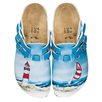 Ganz aktuell hat Birki’s sein Sortiment z.B. um die «Ostsee-Kollektion» erweitert. Diese neue Kollektion umfasst 2 Clog-Modelle, die mit handgemalten maritimen Szenen der norddeutschen Malerin Margit Schönfeld bedruckt sind. Die Ostsee-Clogs «Leuchtturm» und «Seemöwe» passen perfekt zum Sommer und bringen ein Stück Urlaubs-Flair in Ihre Praxis. Für die Ostsee-Clogs wurde das beliebte Schuhmodell «Kay» ausgewählt, bei dem einer der beiden Ristriemen zum Fersenriemen umgeklappt werden kann. Das anatomische Korkfußbett ist mit Leder bezogen, um einen besonders hohen Tragekomfort zu gewährleisten. Die Ostsee-Clogs sind ein Modell der beliebten 2gether Serie, bei der das Motiv als Ganzes erkennbar wird, wenn beide Schuhe nebeneinander stehen.