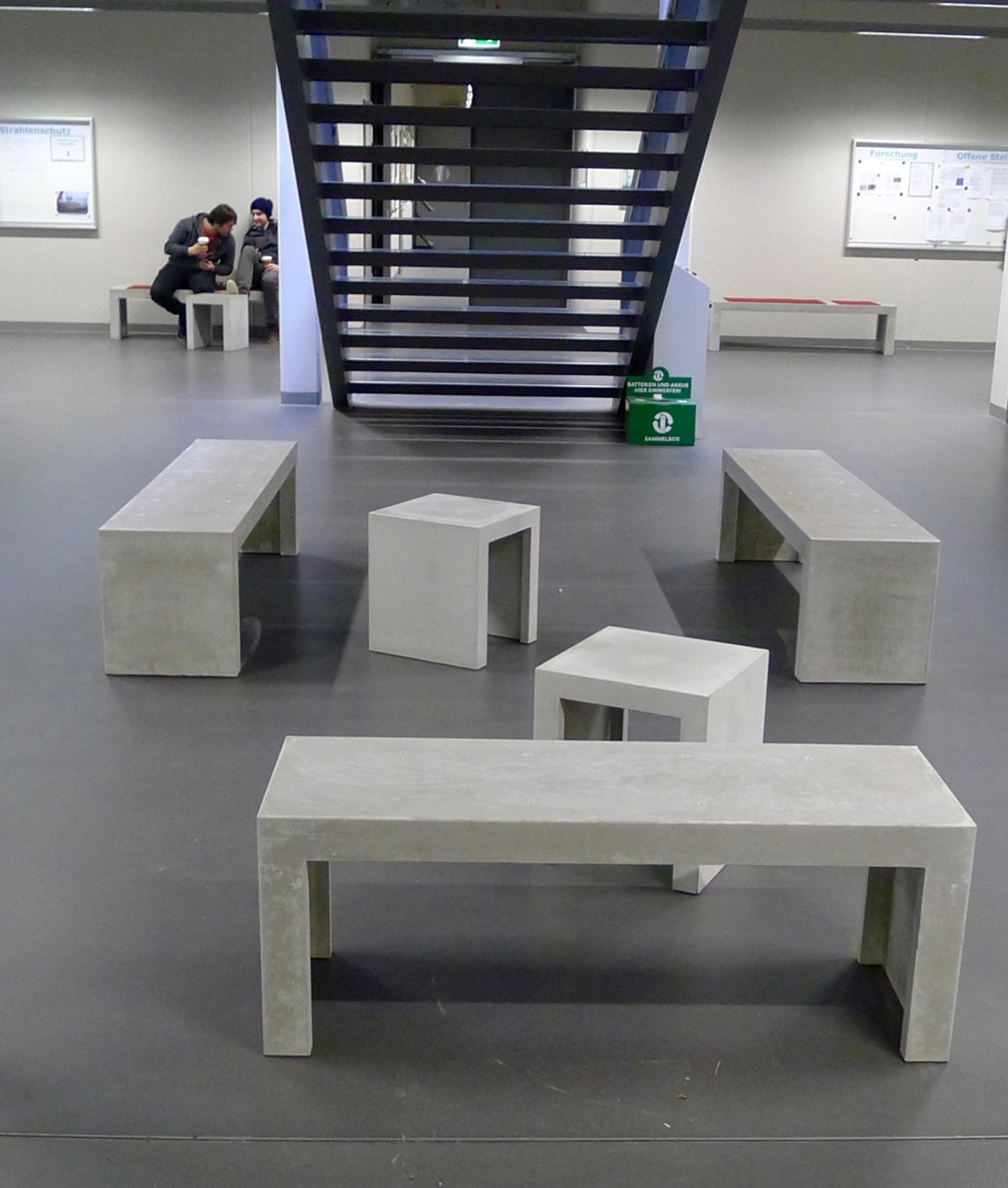 Beton brennt nicht – das gilt auch für Möbel, die daraus hergestellt sind. Vor allem Bänke und Hocker aus Beton passen zudem hervorragend sowohl in moderne Zweckbauten als auch in sanierte Altbauten. Sei es als solitäre Sitzgelegenheiten, sei es als Sitzgruppen oder kombiniert mit Tischen als Arbeits- und Pausenbereiche für Gruppen – Zweckmäßigkeit und moderne Formensprache schließen sich nicht aus.