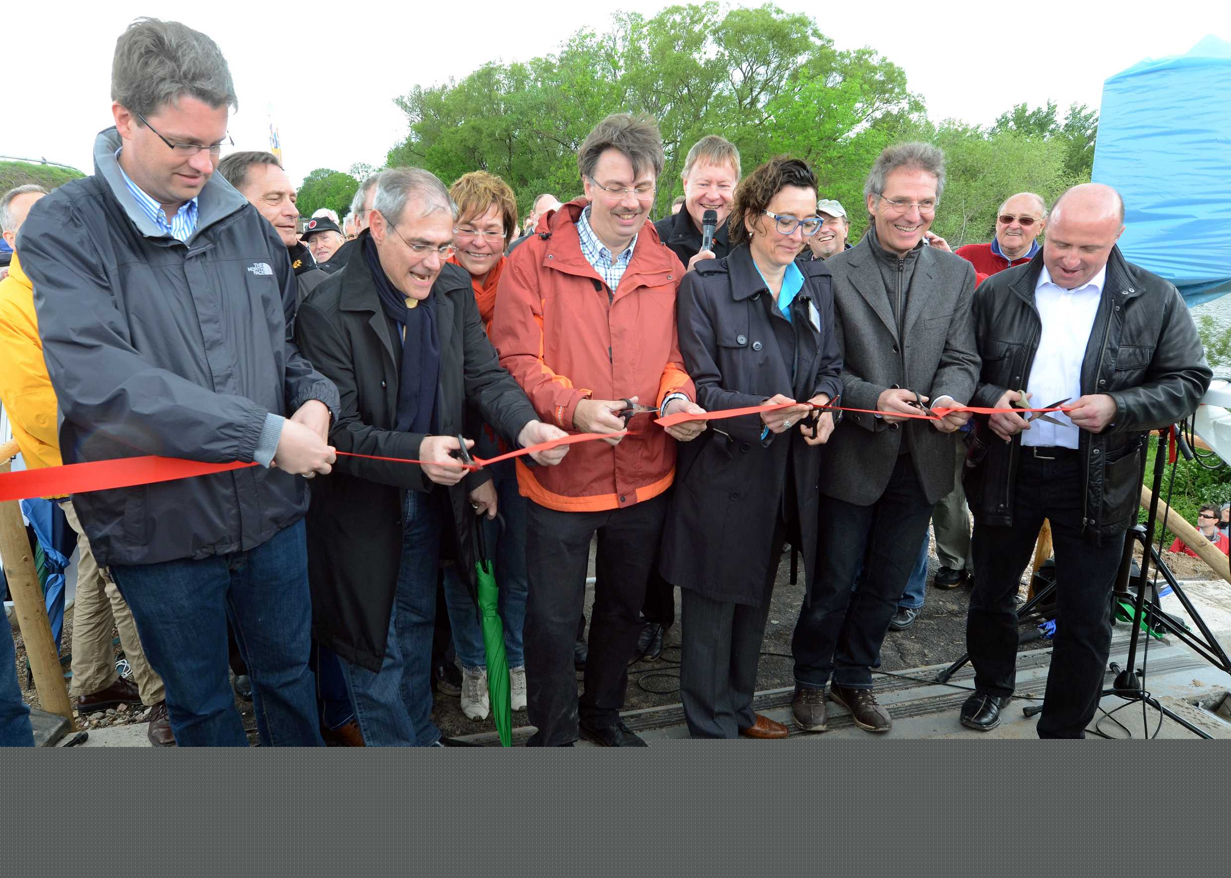 Auf der Westseite des Bauwerkes zerschnitten Rüsselsheims Oberbürgermeister Patrick Burghardt, Raunheimes Bürgermeister Thomas Jühe, sein Amtskollege aus Kelsterbach, Manfred Ockel sowie Dr. Rudolf Kriszeleit, Staatssekretär im Hessischen Justizministerium und Marion Schmitz-Stadtfeld, Leiterin des Fachbereichs Integrierte Stadt- und Gewerbeflächenentwicklung der NH ProjektStadt, das rote Stoffband und gaben den Weg frei. Das Trio der Rathauschefs steht für die 2006 unter dem Namen „Drei gewinnt“ beschlossene interkommunale Kooperation, die den Brückenbau finanziell mitgetragen hat. Die Zusammenarbeit bildet das starke Fundament des Brückenbauwerkes, das vom Architektenbüro Schneider und Schuhmacher konzipiert und unter der Federführung der Ingenieurgesellschaft Schüßler-Plan entstanden ist. Die drei kommunalen Partner hoffen auf mehr Besucher, die künftig über die neue Brücke kommen und die Innenstädte beleben.