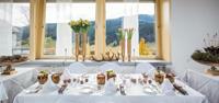 Hochzeitstisch Wenn die Aussicht auf die Berge atemberaubend ist, kann die Kulisse für eine romantische Hochzeit kaum schöner sein. Inmitten der Toggenburger Bergwelt ist das Hotel Hirschen Wildhaus „von Kopf bis Fuß auf Liebe eingestellt“. Ein idyllischer Hotelpark, eine stilvolle Bar, schöne Eventräume und professioneller Service sind die besten Voraussetzungen für ein unvergessliches „Ja“. Damit Brautpaare genau wissen, wie es sich im Hotel Hirschen Wildhaus feiern lässt, lädt das traditionsreiche Hotel sogar zum Probeschlafen und Probeschlemmen ein. An schönen, warmen Tagen startet die Hochzeitsgesellschaft mit einem Apéro im Garten. Nicht weniger exklusiv ist das Flair in der Bar „CHRÜTER & CHOLLER“. Bis zu 110 Gäste finden im Hotel Hirschen Wildhaus zum Essen, Trinken, Feiern und Tanzen Platz. Der Küchenchef und der Sommelier stehen dem Brautpaar bei der Auswahl der kulinarischen Höhepunkte des Tages gern zur Seite. Weil gute Feste oft auch etwas länger dauern, übernachten Freunde und Familie im Hotel Hirschen Wildhaus zum Spezialpreis. Am „Tag danach“ wird das Frühstück bis 12 Uhr serviert. Schließlich sollen sich nach der Hochzeit alle genüsslich ausruhen können. Das Hotel Hirschen Wildhaus gratuliert den frisch Vermählten mit einer kostenlosen Übernachtung im Romantik-Superior-Zimmer inklusive Frühstück und dem Eintritt in die kleine, feine Wellness-Attika des Hauses. Ein Bad im Whirlpool oder eine wohltuende Massage stimmen dort auf den neuen Lebensabschnitt ein. Das Hotel Hirschen Wildhaus ist ein echter Toggenburger. Seit 1871 stehen in dem Traditionshotel zwischen Säntis und Churfirsten in der Ostschweiz Gästen die Türen offen. Heute gilt das Hotel Hirschen Wildhaus als Inbegriff für Erholung in den Schweizer Bergen und hervorragende Kulinarik. Wildhaus auf dem 1.095 Meter hohen Passübergang zwischen Rheintal und Toggenburg ist das höchstgelegene Dorf im Schweizer Kanton St. Gallen. Simone Müller-Walt und Michael Max Müller führen das Hotel Hirschen Wildhaus in sechster Generation, sehr persönlich und mit großem Engagement.