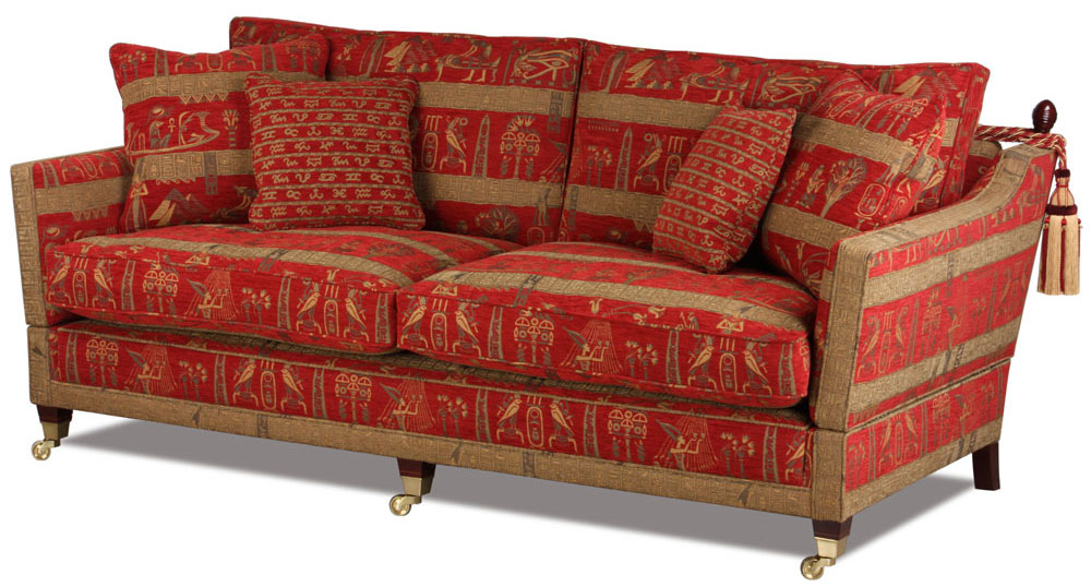 Das Regency Knole Sofa wird noch in traditionell handwerklicher Art und Weise von einen kleinen Manfaktur in England angefertigt. Die solide Federkernunterpolsterung bietet in Verbindung mit dem Grundgestell aus massivem Buchenholz einen hervorragenden Sitzkomfort und eine lange Haltbarkeit.