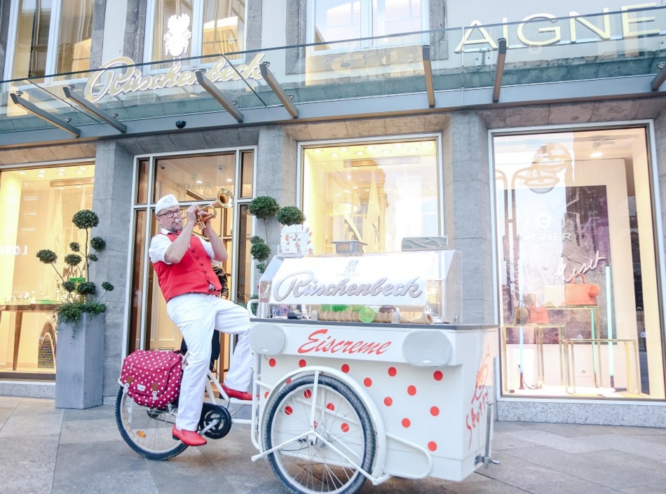 Um diesen Wachstum zu feiern und neue Kunden zu gewinnen, engagierte Rüschenbeck die Kölner Eventmanagerin Ellen Kamrad mit der Planung und Organisation einer Roadshow quer durch NRW. Es galt die neue Just Jewels Kollektion des Juweliers zu präsentieren und Kunden durch einzigartige Aktionen zu begeistern. Um diesen Zielen gerecht zu werden, setzte Ellen Kamrad auf ein erfrischendes Showkonzept mit einem ungewöhnlichen Künstler. Sie engagierte einen Trompete spielenden Eismann, der mit seinen amüsanten Showeinlagen und schwungvollen Musikeinlagen auf der Trompete für reichlich Aufmerksamkeit vor den Rüschenbeck-Filialen sorgte. Passend zu der glaskaren, funkelnden Just Jewels-Kollektion des Juweliers verteilte der Eismann kostenlos leckere Eisspezialitäten an die Fußgänger und Zuschauer – und sorgte für neugierige und interessierte Blicke auf die Just Jewels-Kollektion. Denn einzig für diese Roadshow wurden neue Eiskreationen geschaffen. So durften die Besucher sich an „Vanilla Rainbow mit funkelnden Perlen“, „Strawberry Juicy mit rotem Juwel“ oder auch „Schlumpf Ice mit blauem Stein“ erfrischen. Ein Konzept, das den Besuchern schmeckte, sie neugierig machte und einen interessierten Blick auf die wahren Schmuckstücke der Just Jewels-Kollektion werfen ließ.