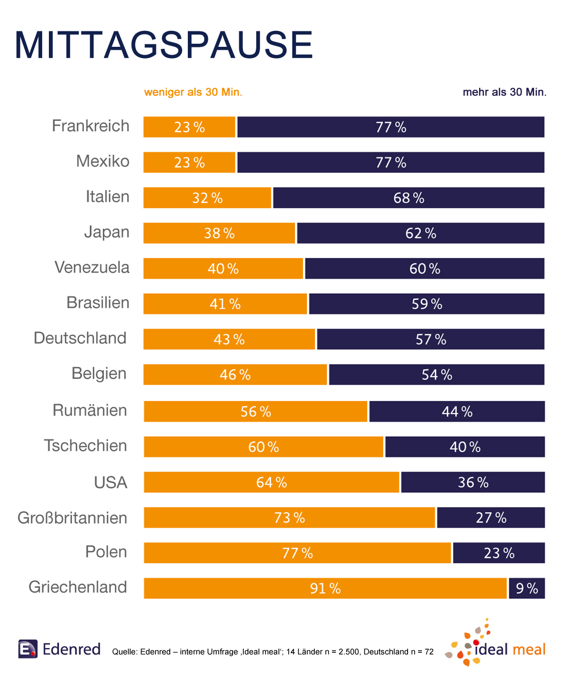 Die Franzosen nehmen sich am meisten Zeit für ihre Mittagspause. (Quelle Edenred)