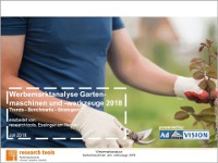 Die „Werbemarktanalyse Gartenmaschinen und -werkzeuge 2018“ von research tools untersucht die Werbeausgaben für Gartenmaschinen und -werkzeuge in Deutschland. Sie gibt auf 144 Seiten Einblick in Trends, Benchmarks und Strategien in sieben Teilmärkten. Neben der Entwicklung von Werbespendings für 70 Werber werden Fünf-Jahres-Trends erstellt. Eine Analyse der Kommunikationsstrategien zehn wichtiger Werbungtreibender untersucht quantitative und qualitative Parameter und zeigt bedeutende Werbemotive.