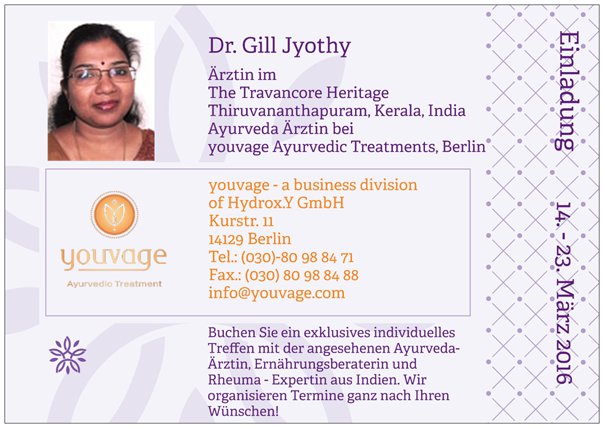 Vom 14. – 23 März haben alle Interessentin die Möglichkeit Dr. Jyothy im youvage Zentrum persönlich kennen zu lernen!