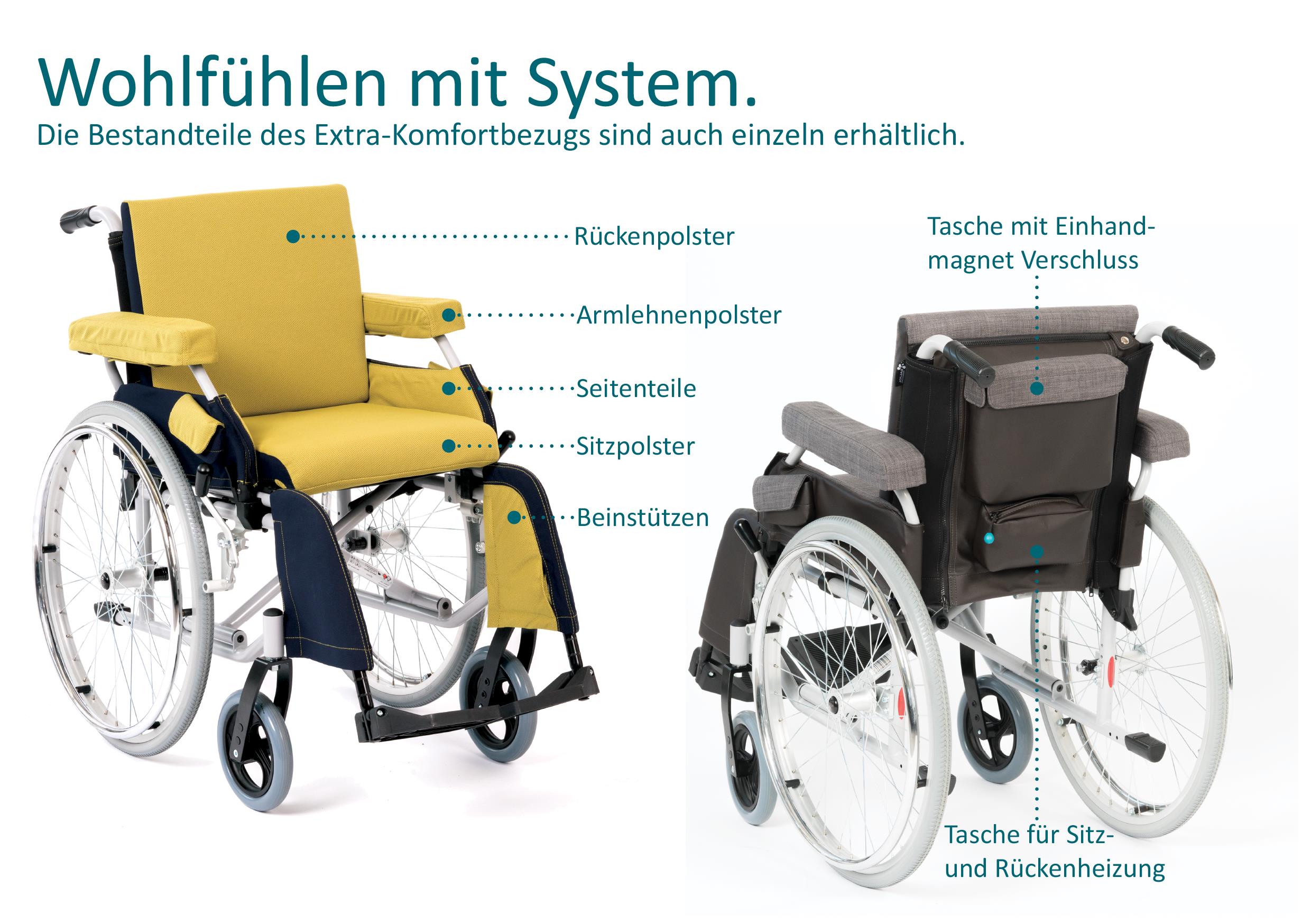 Neben den kompletten Extra-Sets sind folgende Komponenten einzeln erhältlich: Rücken- und Sitzpolster mit Taschensystem, Sitzpolster, Rückenpolster, Armlehnenpolster und Beinstützenpolster. Als Sonderzubehör gibt es außerdem die Sitz- und Rückenheizung, die Inkontinenzauflage sowie Gamaschen zum Schutz der Beine beim Trippeln. Denn beim Trippeln, bei dem man sich im Rollstuhl sitzend mit den Füßen vorwärtsbewegt, stoßen sich viele an den Ecken der (abgenommenen) Beinstützenaufnahme. Die Gamasche wird einfach übergestülpt und festgeklettet und schützt so vor Verletzungen.