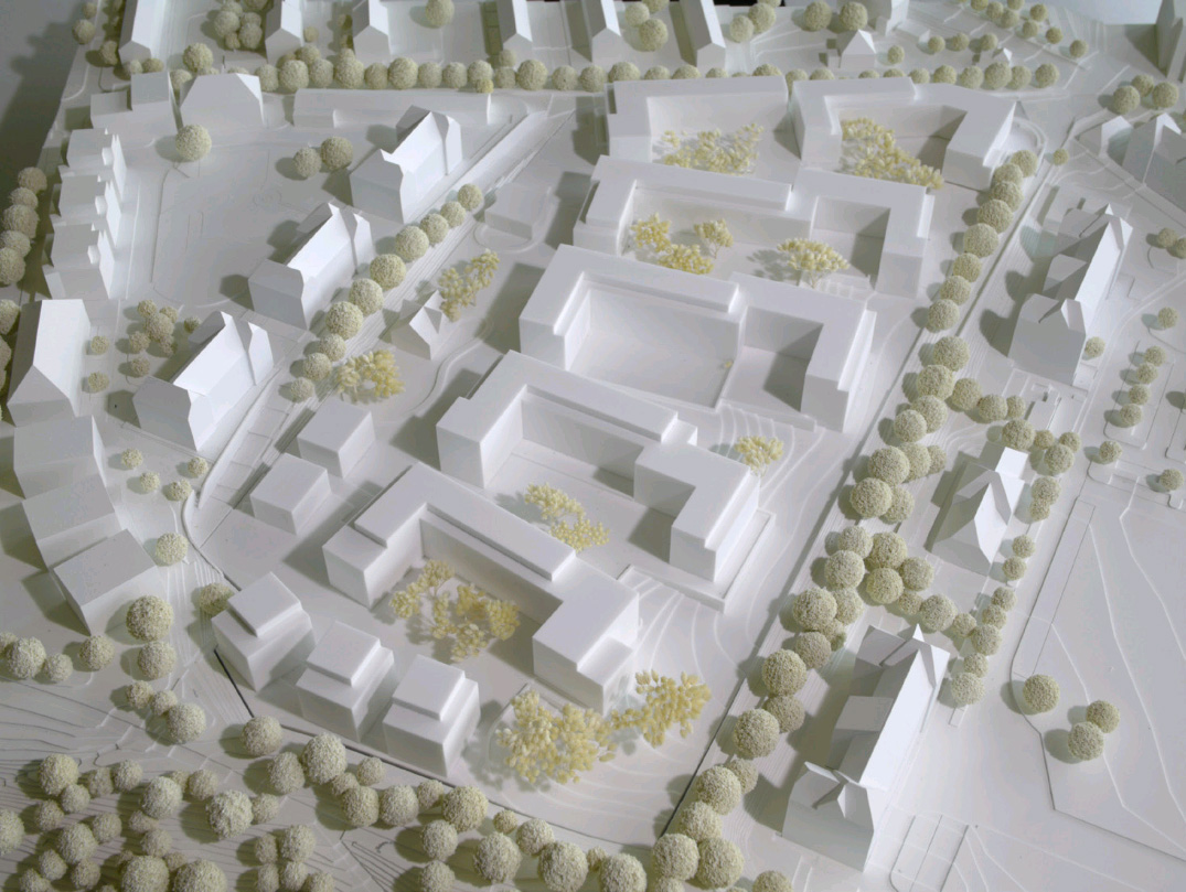 Die Wettbewerbsarbeit sieht eine fächerförmige Bebauung aus fünf in Ost-Westrichtung verlaufenden, langgestreckten U-förmigen Baukörpern vor. Mit ca. 48.000 Quadratmetern Geschossfläche liegt die Dichte der Bebauung im angestrebten oberen Bereich. Besonders gewürdigt wurde durch das Preisgericht die „städtebauliche Gesamtfigur und die klar definierte Kante an der ringförmigen Erschließungsstraße als Begrenzung des Gebietes und eindeutiges Gegenüber zur vorhandenen Bebauung“. Bestechend fand die Jury darüber hinaus „die Spannung zwischen eindeutig definiertem öffentlichen Raum und nach Süden ausgerichteten privaten Freiflächen mit unterschiedlichen Ausformungen innerhalb der baulichen Struktur“.