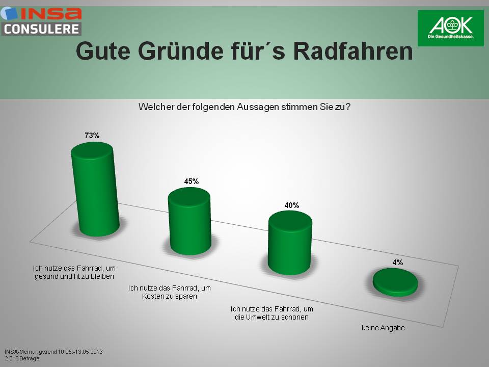 Die Umfrage ergab zudem, dass jeder sechste Erwerbstätige auf dem Fahrrad zur Arbeit kommt. „Dadurch absolvieren viele Arbeitnehmer bereits auf dem Weg zur Firma ihr tägliches Fitnessprogramm. Das ist ganz in unserem Sinne. Und natürlich profitieren auch die Unternehmen davon, denn gesunde und motivierte Arbeitnehmer sind deren Schlüssel zum Erfolg“, sagte Jürgen Graalmann, Vorstandsvorsitzender des AOK-Bundesverbandes. „Es wäre schön, wenn sich noch mehr Menschen dafür entscheiden würden.“ Potenzial scheine ausreichend vorhanden zu sein. Denn so zeigen die Ergebnisse auch, dass fast 17 Prozent der Erwerbstätigen gar kein Fahrrad besitzen.