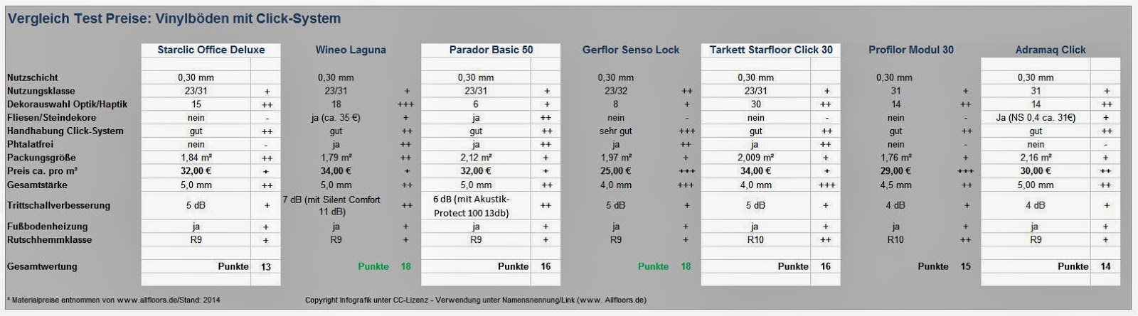 Für uns waren die Ergebnisse unseres Test-Vergleiches eindeutig. Vinyl-Bodenbeläge mit Klicksystem halten ohne weiteres einer genauen Prüfung stand und eignen sich durchaus als günstigere Alternativen zu teureren Echtholzböden. Neben der Gesundheitsverträglichkeit spielen auch Faktoren wie Preis und Dekorauswahl eine große Rolle bei der Auswahl der Vinyl-Bodenbeläge. Den ganzen Test-Preis-Vergleich der Vinylböden mit Klicksystem (http://bodenbelag.allfloors.de/2014/06/preis-vergleich-test-gunstige-klick-vinylboden.html) , detaillierte Ergebnissen und Überblick über aktuelle Vinylboden-Kollektionen gibt es hier.