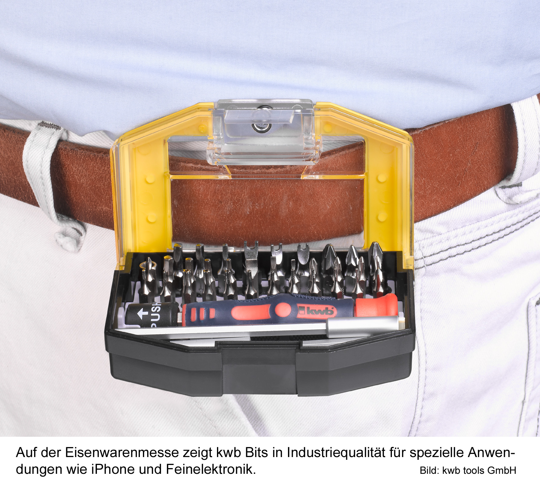 Beide Bit-Boxen, „Bits for Bytes“ und „Safety-Bits“, sind aus stabilem und bruchsicherem Kunststoff. Besucher der Eisenwarenmesse können testen, wie einfach und praktisch sich die Bit-Boxen mit einem Clip am Gürtel befestigen lassen. So getragen lässt sich die Box im 90-Grad-Winkel öffnen, so dass der Anwender die Bits von oben sehen und zielgerichtet entnehmen kann. Weiterer Vorteil: Bei dieser von kwb entwickelten Verschlussvariante fallen die Bits nicht aus der Box und können nicht verloren gehen.