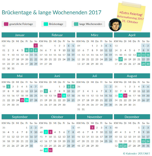 Dass Christi Himmelfahrt (25. Mai 2017) stets für einen Brückentag sorgt, ist bekannt. Weil der Feiertag immer auf einen Donnerstag fällt, ist der folgende Freitag ein beliebter Brückentag. Im Jahr 2017 lädt jedoch auch der Tag der Deutschen Einheit dazu ein, eine Brücke zum Wochenende zu bauen: Der 3. Oktober 2017 ist ein Dienstag, sodass der Montag davor zum Brückentag wird. Genauso verhält es sich mit dem Reformationstag am 31. Oktober 2017. Dieser fällt ebenfalls auf einen Dienstag und generiert dadurch einen zweiten Brückentag im Monat Oktober.