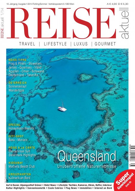 Auch wenn das neue Design frischen Wind mit sich bringt, ist der Inhalt der neuen Ausgabe umfangreich wie gewohnt. Auch diesmal ist wieder für jeden Leser etwas dabei. Wer von Luxus-Urlaub träumt, wird hier ebenso fündig wie Romantiker, Verliebte, Verheiratete, Kreuzfahrten-Fans, Feinschmecker, Erholungssuchende und Action-Begeisterte. „Unser erfahrenes Team war wieder in allen Ecken dieser Welt unterwegs und hat neben interessanten Berichten auch traumhafte Fotos mitgebracht. Ob vom Tauchen in Ägypten oder von den Kanalinseln Gurnsey und Jersey oder von Irland.“, zeigt sich Christian Böhm begeistert. Mit im Gepäck hat die neue Ausgabe mitreißende Artikel über den facettenreichen australischen Bundesstaat Queensland, Eindrücke aus Baku, der feurigen Metropole und Hauptstadt Aserbaidschans sowie eine großflächige Reportage über den berühmten Marbella Beach Club, Hotspot der Schönen und Reichen in Südspanien sowie viele weiter Reisehighlights rund um den Globus.