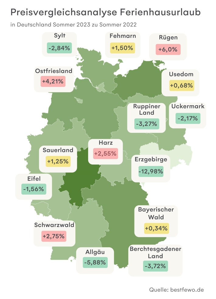 In vielen Lebensbereichen müssen Verbraucher derzeit tiefer in die Tasche greifen. Energie, Lebensmittel, Flüge, Pauschalreisen – alles wird teurer. Wirklich alles? Nein, es gibt auch Ausnahmen. Wer im Sommer nächsten Jahres eine Woche Urlaub in einem Ferienhaus oder einer Ferienwohnung in Deutschland verbringt, zahlt dafür im Durchschnitt keinen Cent mehr. Unterm Strich wird die Urlaubswoche sogar um rund 10 EUR. (- 0,75%) günstiger – so das überraschende Ergebnis einer umfassenden Preisvergleichsanalyse von bestfewo, dem mit mehr als 125.000 Unterkünften größten Anbieter für Ferienhaus-Urlaub in Deutschland. Insgesamt verglichen die Urlaubsexperten aus Potsdam mehr als eine halbe Million Preise für die Monate Juni bis August 2022 mit denen für den Sommer 2023.