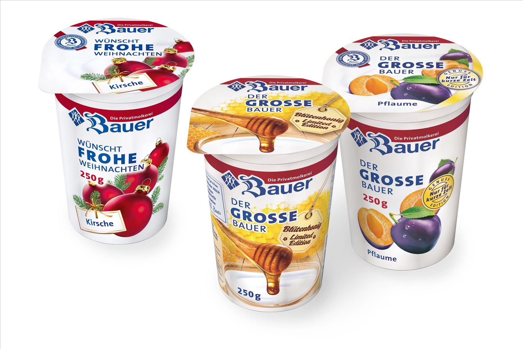 Die drei limitierten Sondereditionen „Der große Bauer Blütenhonig“, „Der große Bauer Pflaume“ sowie „Der große Bauer Kirsche“ im Weihnachtsgewand sind als 250g-Becher zum unverbindlichen Ladenverkaufspreis von 0,65 Euro im Handel erhältlich.