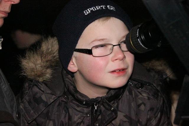 Nach den Sternen greifen: dieses Motto und die Sterne in ihrem Logo waren es, die die im September eröffnete Josef-Kentenich-Grundschule in Kempten-Leubas dazu bewegte, die Sternwarte Kempten am 23. Januar zur Himmelsbeobachtung einzuladen. Eine Flut von Fragen der neugierigen Kinder und überraschende und anschauliche Vergleiche von Professor Eimüller lassen auch die Eltern staunen. Dass Sebastian Vettel mit seinem Rennauto bei 300 Stundenkilometer 22 Jahre brauchte, um von der Sonne zum Merkur zu kommen, geht ebenso ein wie das Zischen der geschüttelten Sprudelflasche, aus der das gleiche Gas kommt, das die Venus einhüllt.