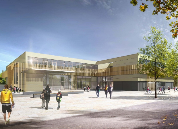 Das gesamte neue Gebäude wird barrierefrei sein und ist auf die Anforderungen eines Ganztagsbetriebs ausgelegt. Zwölf Klassen werden darin Platz finden. Der zweigeschossige Stahlbetonbau besteht aus zwei Flügeln. Im Obergeschoss sind die Klassenräume untergebracht, im Erdgeschoss entstehen ein zentraler Foyerbereich, eine Mensa-Küche und weitere Räume für unterschiedliche Nutzungen. Auf klassische Schulflure haben die Architekten zugunsten von großzügigen und flexibel nutzbaren Spiel- und Aufenthaltsflächen verzichtet. Die Fassade ist geprägt von einem markanten Fluchtbalkon aus Holz, der um das gesamte Gebäude verläuft und von jedem Raum aus zugänglich ist. Im Nordflügel entsteht eine fünf Meter hohe Kleinsporthalle mit eigenem Zugang. So sind Halle und Umkleidebereich auch für externe Nutzer erreichbar.